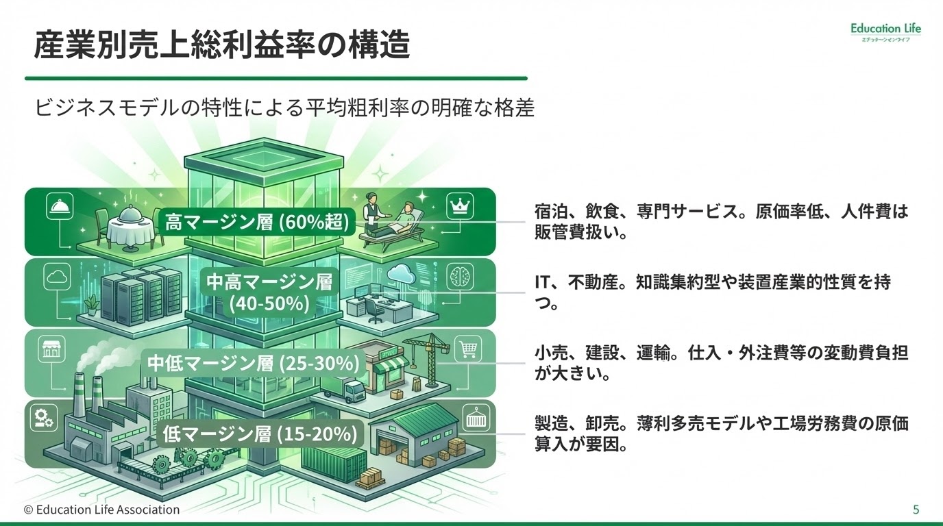 製造業の粗利率(約21%)が低いのは、工場の固定費(人件費・償却費)が原価に含まれるためです。ここでは「何を作っているか」が重要です。